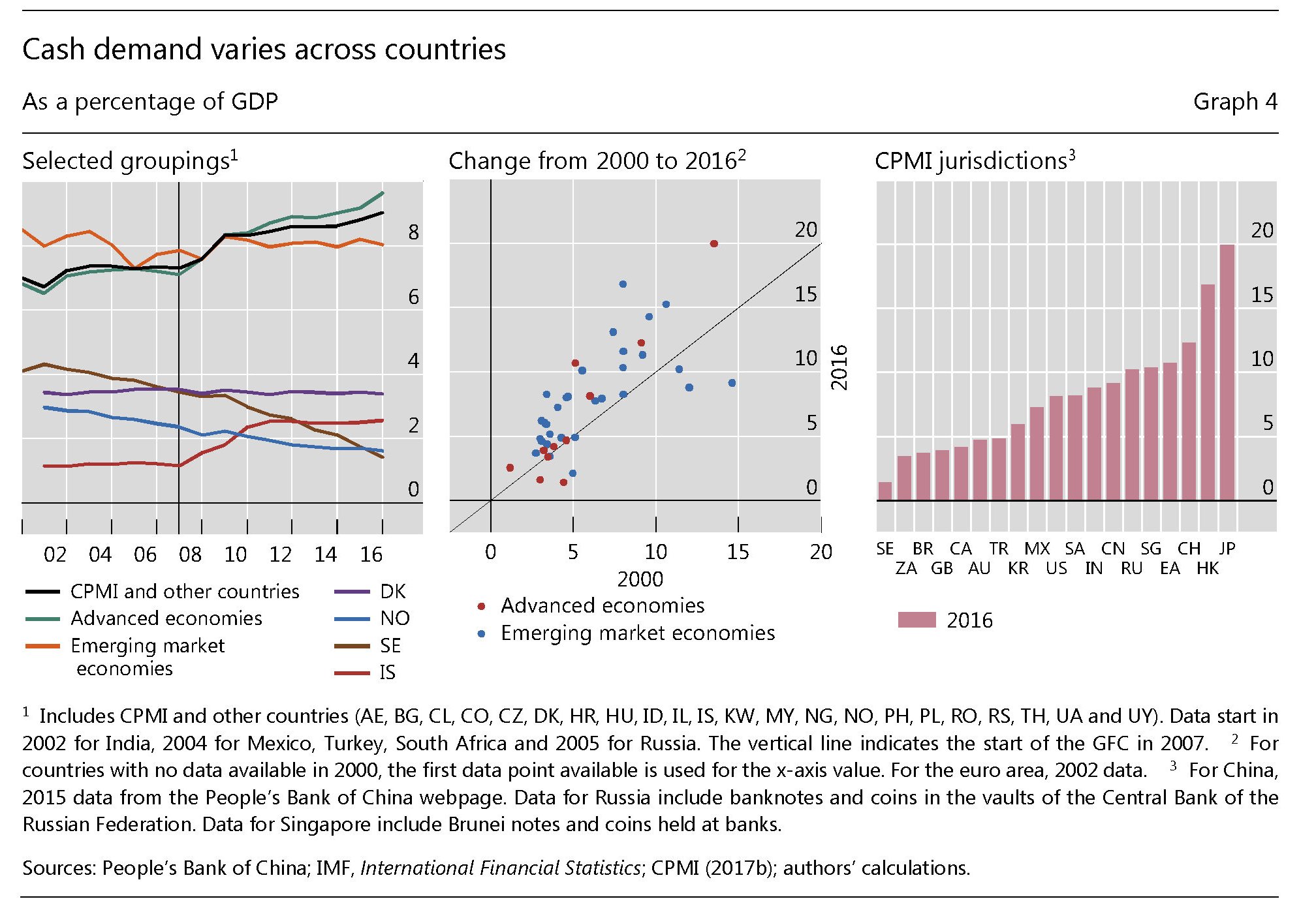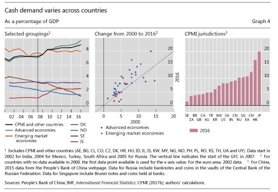 L’aumento dei pagamenti elettronici però non è andato a detrimento di quelli tradizionali. Il totale delle banconote in circolazione il relazione al pil, un modo comunemente usato per misurare la domanda di cash, è cresciuto dal 7 al 9% del pil nel panel dei paesi considerati. A guidare tale crescita sono stati proprio i paesi avanzati all’indomani della crisi finanziaria, con Hong Kong e il Giappone con gli incrementi più significativi registrati (dal 9 al 7% del pil rispettivamente). Al contrario l’uso del contante è diminuito in Cina del 5%.