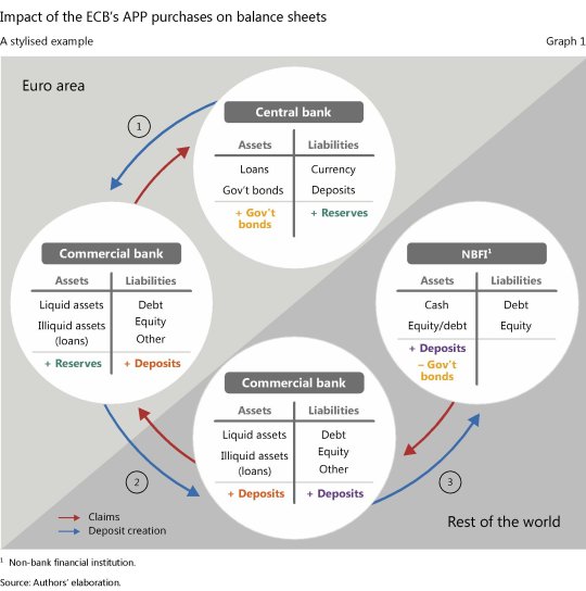 Fra le tante questioni problematiche che la Brexit porta con sé è opportuno sottolinearne una che emerge con chiarezza grazie a una ricerca contenuta nell’ultima quarterly review della Bis, dove si osserva l’impatto del QE di Francoforte sui flussi finanziari internazionali di obbligazioni e depositi. Ricordo che l’APP ( asset purchase programme) della Bce consentiva alla banca centrale di acquistare titoli sovrani dell’eurozona, secondo regole precise, sul mercato secondario. Significa che altri soggetti finanziari, sia bancari che non bancari, hanno scambiato titoli sovrani in cambio di denaro fresco, che nel caso delle banche è stato creato con un aumento delle riserve. Chi volesse ricordare come funziona il bilancio di una banca centrale può scorrere la miniserie che abbiamo dedicato al tema qualche tempo fa.