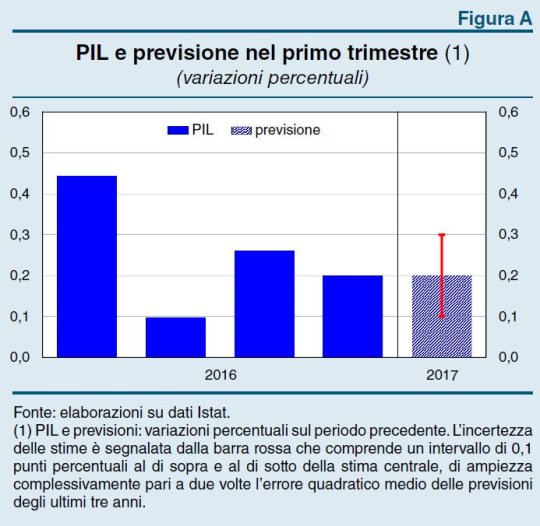 Quanto a noi, me la cavo con la auguste parole della Banca D’Italia che ha lanciato il suo Bollettino trimestrale proprio mentre stavo qui a scervellarmi, e per fortuna perché stavo a secco di idee. Qui ne trovo a bizzeffe. A parte l’inflazione, che l’occhiuta via Nazionale fotografa in media all’1,3% sul primo trimestre 2017 “il livello più elevato degli ultimi quattro anni”, a far titolo è il dato previsionale sul pil del primo quarto dell’anno, che viene visto in crescita dello 0,2.
