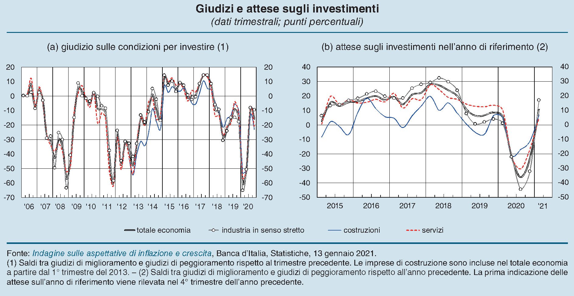 “Per il primo semestre – scrive la Banca – dell’anno il saldo tra chi prefigura un aumento e chi si attende una riduzione degli investimenti è più elevato nell’industria rispetto ai servizi (18,4 e 1,7 punti percentuali, rispettivamente) e in miglioramento rispetto a quello riferito alla seconda metà del 2020”.