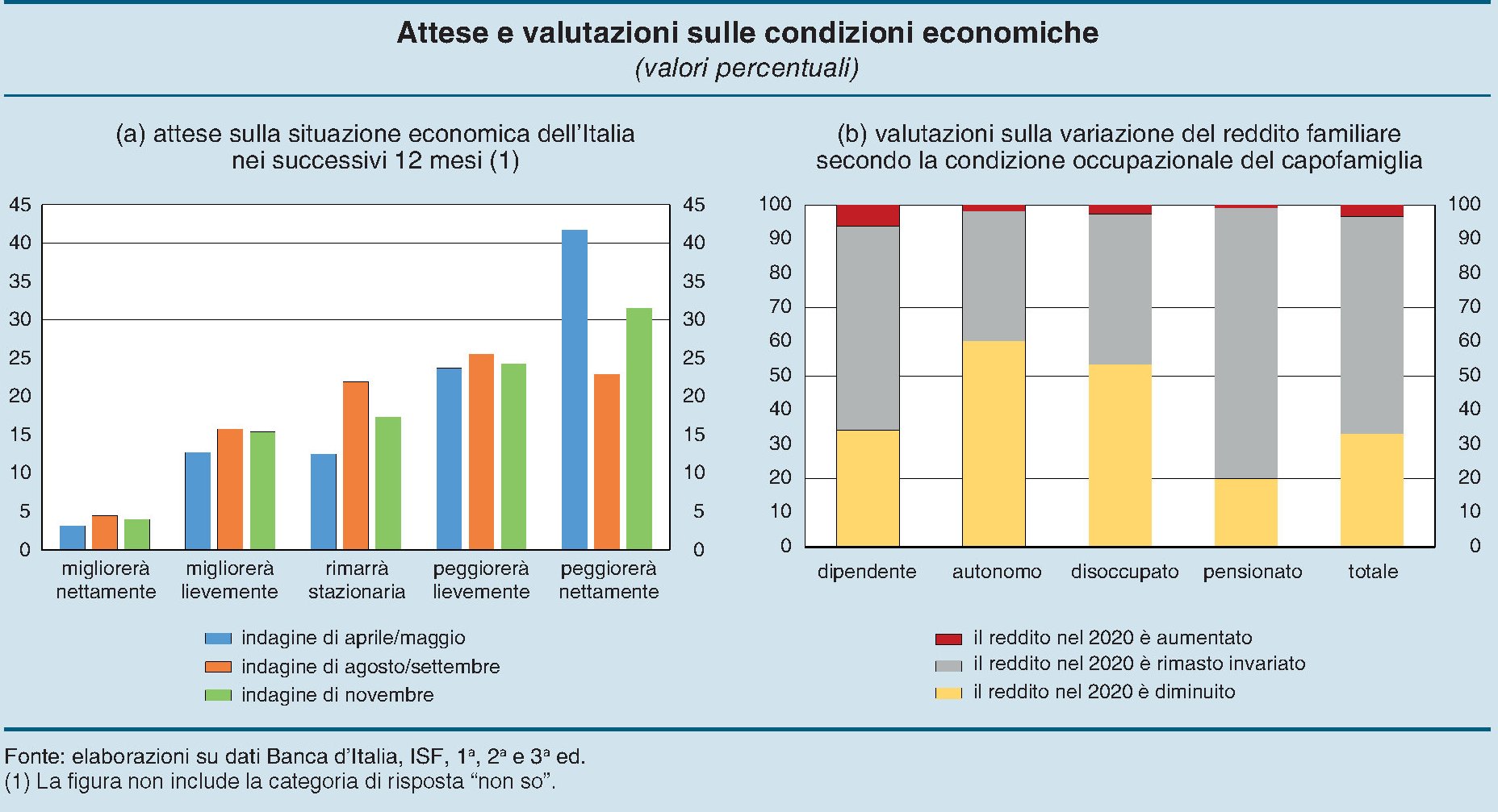 L’ultimo bollettino economico di Bankitalia è una lettura obbligata per chi volesse sbirciare fra gli umori mutevoli nel nostro paese, sia delle famiglie che delle imprese. La Banca infatti ha svolto i consueti sondaggi a campione che consentono di fotografare le aspettative di produttori e consumatori e ne ha tratto uno scenario in chiaroscuro, dove emerge con chiarezza che i soggetti economici sono meno pessimisti di aprile, ma anche meno ottimisti di giugno. La seconda ondata autunnale ha infranto molte speranze, sembra di capire. E di questo occorrerà tenere conto nel primo semestre di quest’anno nell’elaborazione delle politiche economiche.