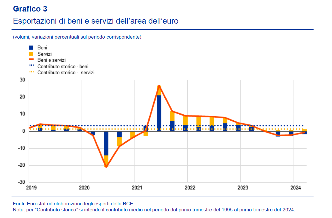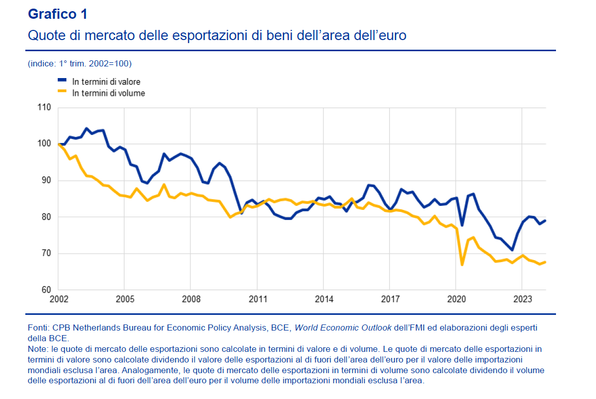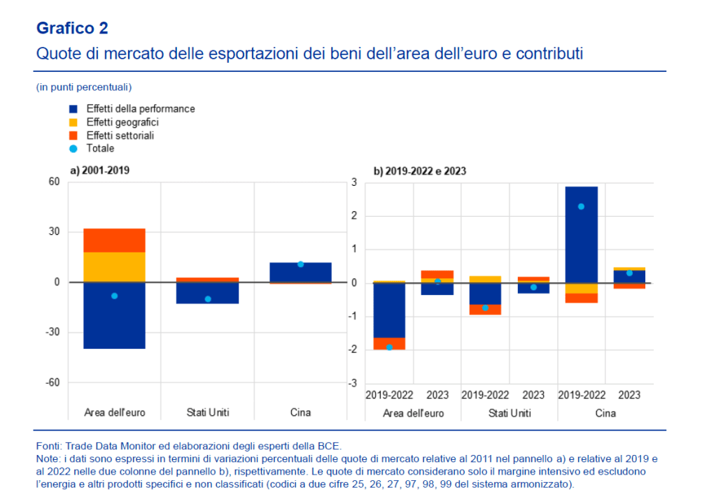 La lettura del Bollettino ci fornisce alcune informazioni utili, per cominciare, che ci aiutano a mettere maggiormente in chiaro alcuni elementi. “Dopo la ripresa successiva alla pandemia, gli esportatori dell’area hanno di nuovo tratto beneficio da alcuni fattori più favorevoli di tipo settoriale e
