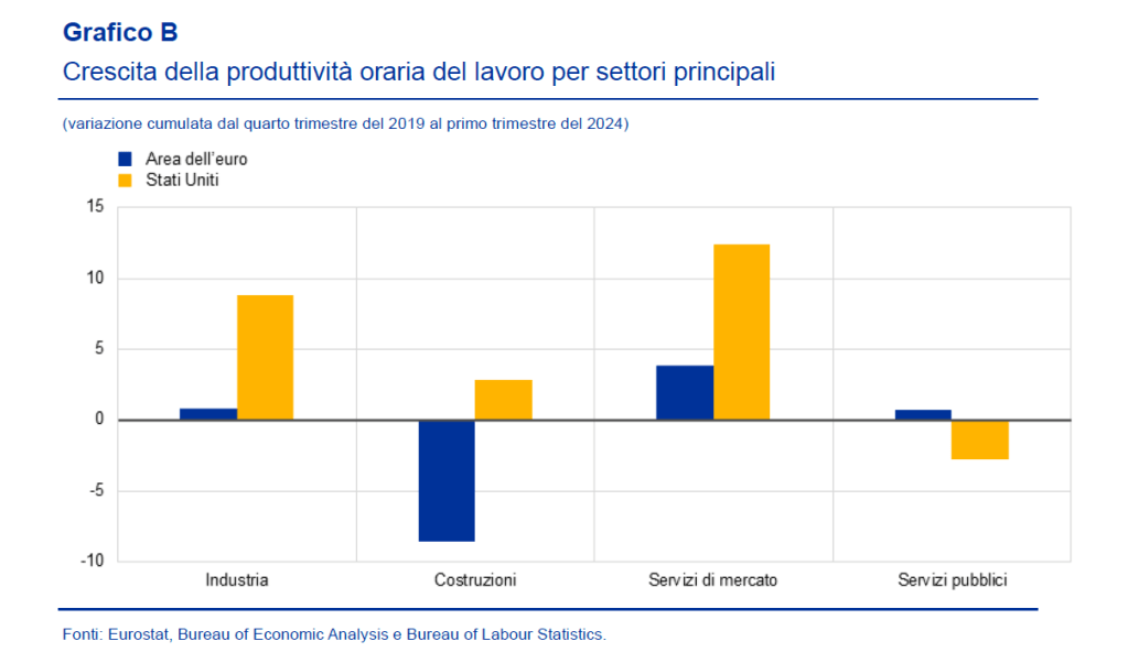 Una serie di fattori congiunturali, legati agli incentivi salariali concessi negli Usa e allo shock energetico vissuto dall’Ue, contribuiscono a spiegare questi andamenti. Ma rimane la tendenza storica di fondo: i lavoratori Usa sono più produttivi di quelli europei. Nel settore dei servizi di mercato, sempre nel periodo considerato, questa forbice è ancora più evidente: negli Usa la produttività è cresciuta del 12,4 per cento, nell’Ue del 3,8. Siamo, a dir poco, anchilosati.