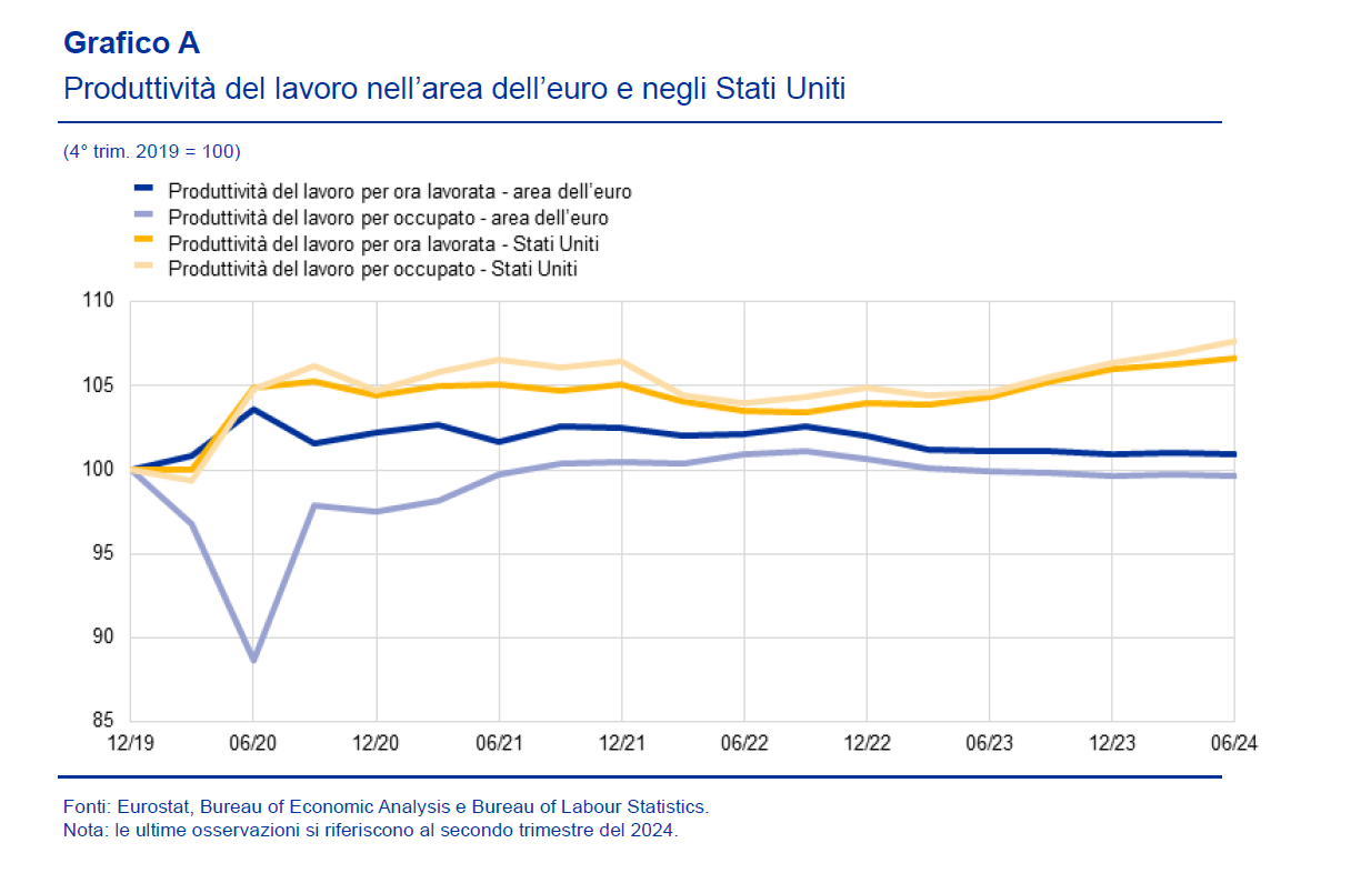 Molto opportunamente la Bce tenta di spiegare le ragioni della profonda differenza di crescita osservata dopo la pandemia fra Usa e Ue, con la seconda ad arrancare – circa il 3% di crescita fra il quarto trimestre del 2019 e il quarto trimestre 2023 – e la prima a correre, con una crescita superiore all’8%.