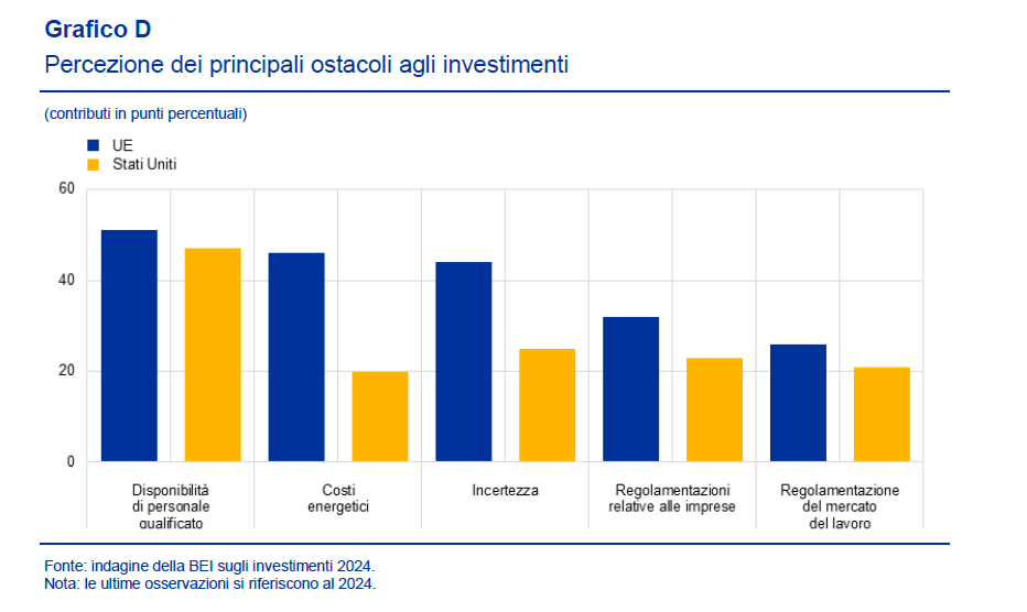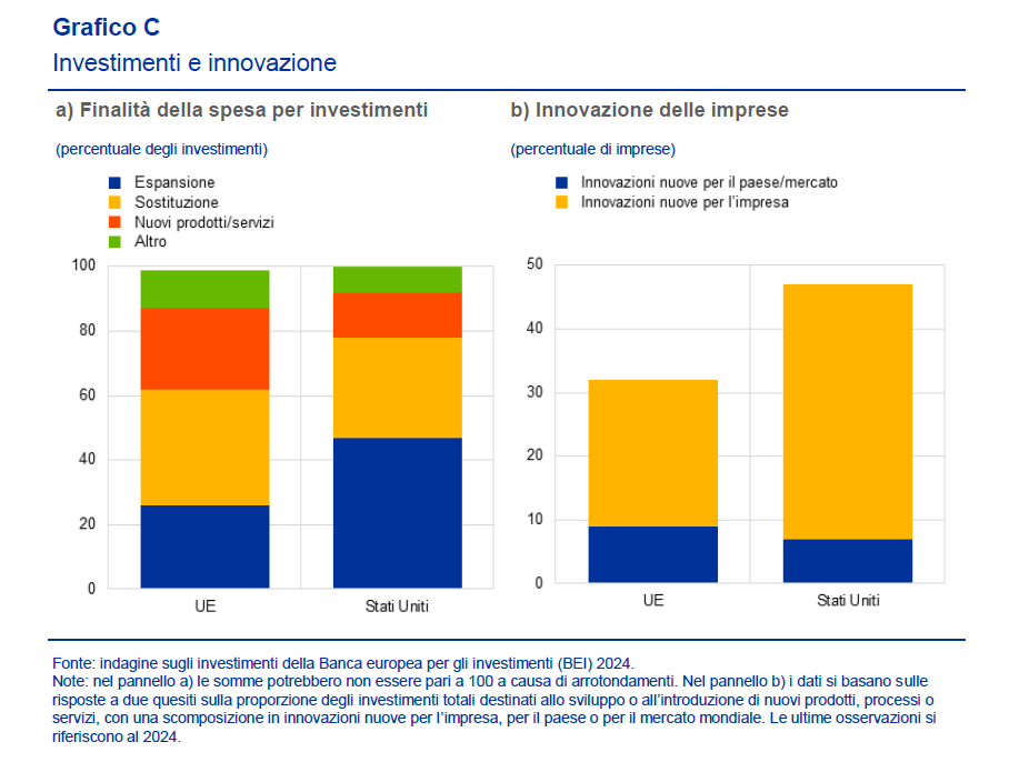 Dulcis in fundo, “un significativo differenziale di investimenti immateriali, relativo alla spesa per innovazione e per ricerca e sviluppo (R&S), che contribuisce ad ampliare il divario di produttività tra l’UE e gli Stati Uniti”. Negli Usa infatti, secondo un’analisi svolta dalla BEI “gli investimenti delle imprese statunitensi tendono inoltre a concentrarsi maggiormente sull’innovazione rispetto a quelli delle imprese dell’UE”, dove si investe per lo più in settori maturi (autoveicoli e attrezzatura) mentre negli Usa si punta su TLC, data center, IA.