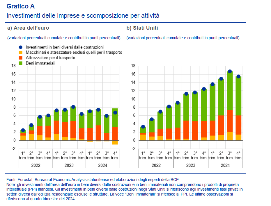 Si conferma, insomma, l’ampia divergenza fra le due economie, che poi si riflette anche sui tassi di crescita ben diversi. Ma non solo. Gli investimenti Usa non sono solo più abbondanti, hanno anche caratteristiche molto diverse da quelli europei. Gli Usa, infatti, primeggiano negli investimenti immateriali, quindi i prodotti di proprietà intellettuale, mentre gli investimenti europei della stessa categoria arrivano a stento alla metà.