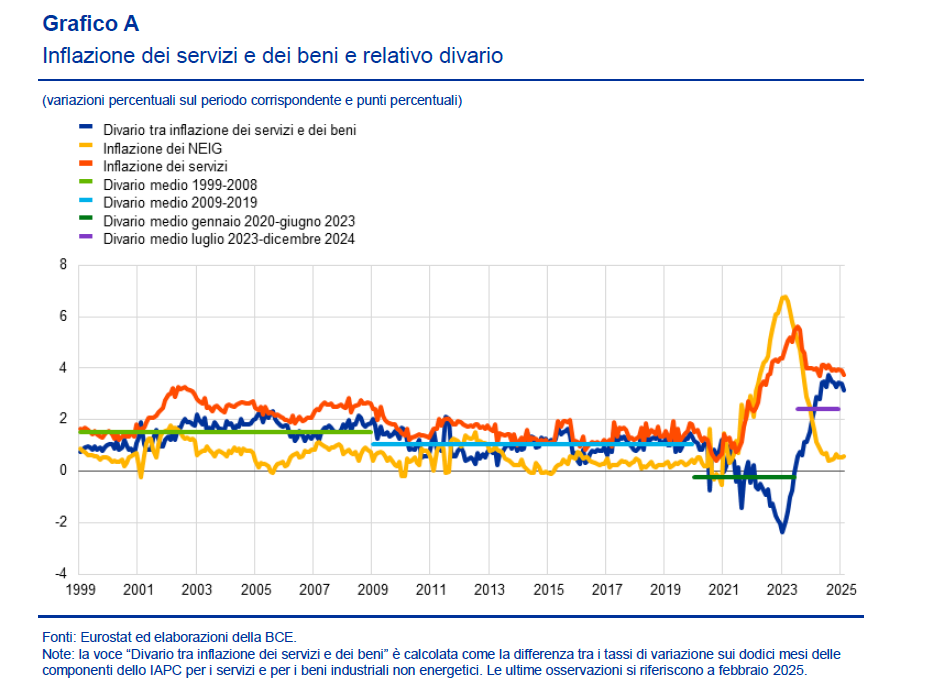 Staremo a vedere cosa porterà il futuro. Nel frattempo però è opportuno soffermarsi a d analizzare quello che ci comunica il presente, che porta con sé alcune singolarità, una delle quali viene illustrata nell’ultimo bollettino della Bce: la notevole crescita del divario fra inflazione dei servizi e quella dei beni.