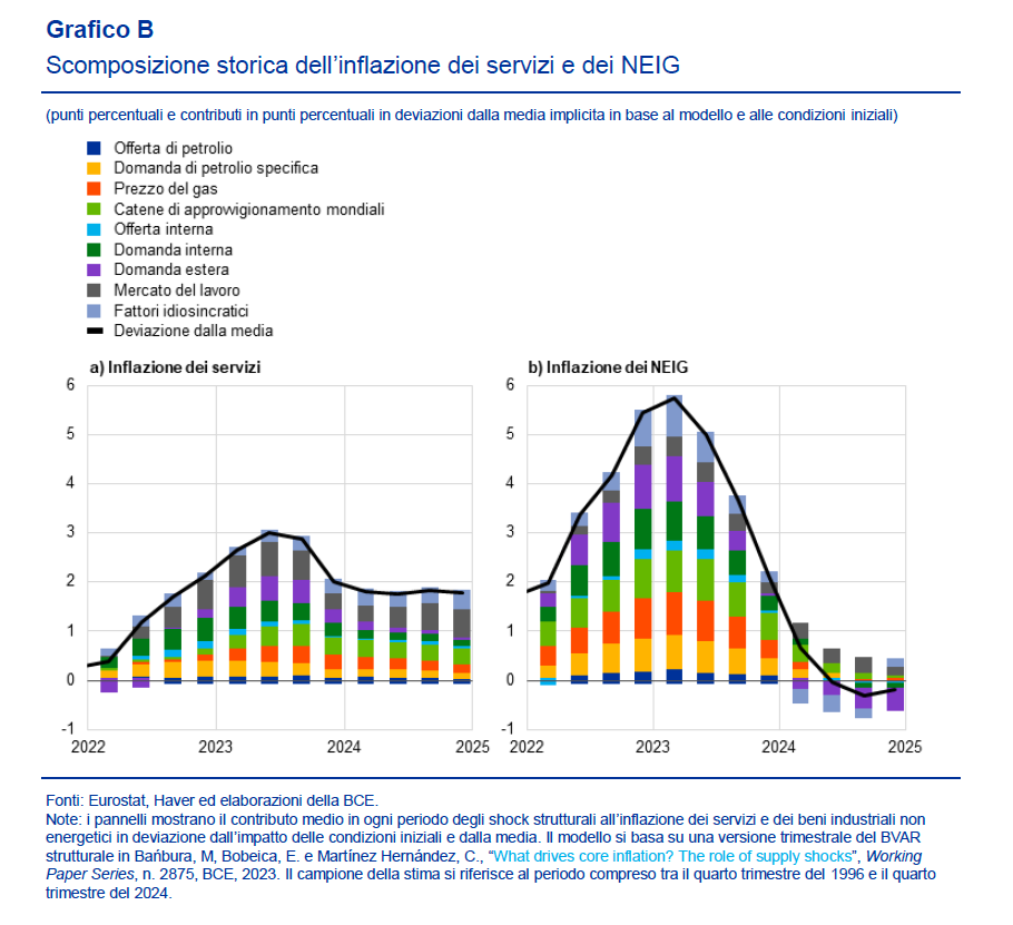 Ma dal 2023 questa tendenza si è bruscamente invertita. Mentre i prezzi dei beni industriali non energetici (non-energy industrial goods, NEIG) si riportavano gradualmente verso i target di banca centrale, quelli dei servizi scendevano solo di poco dai picchi raggiunti. Quindi mentre l’inflazione dei beni, che secondo la Bce è altamente sensibile alle oscillazioni dei costi dell’energia e quindi tanto facilmente aumenta quanto facilmente diminuisce, quella dei servizi è particolarmente insidiosa. Il motivo: “L’impatto degli shock all’offerta è stato più duraturo e persiste la pressione al rialzo derivante dagli shock sul mercato del lavoro, insieme alle pressioni salariali ancora forti”.
