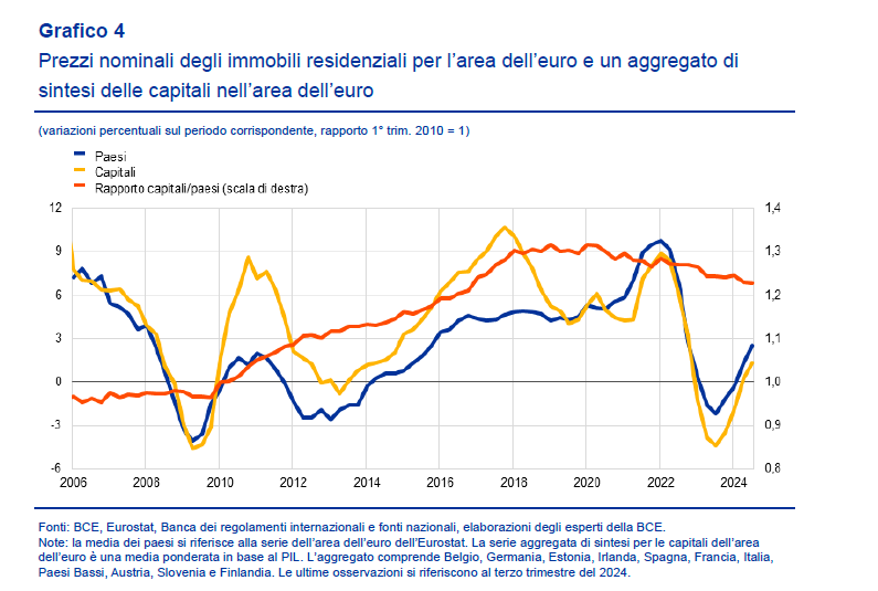 Senonché, come dicevamo, con la pandemia questo squilibrio si è andato via via riducendo. Addirittura la crescita dei prezzi nelle capitali si sta rivelando più lenta di quella osservata nella media dei paesi dell’area. Da un parte questo potrebbe dipendere dal fatto che i prezzi nelle capitali hanno raggiunto un picco, ma “con maggiore probabilità anche l’impatto specifico e crescente della pandemia e le sue implicazioni per il lavoro a distanza, hanno permesso ai lavoratori di vivere più lontano dai propri