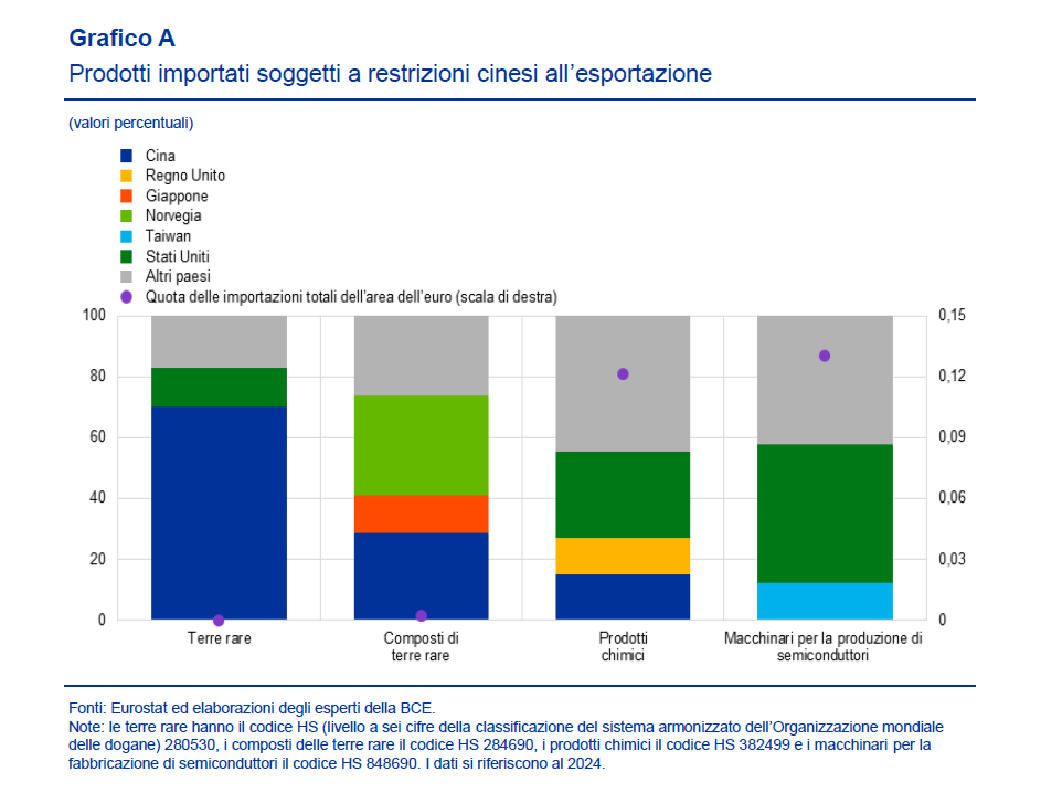 A tal proposito è utile ricordare che le terre rare svolgono un ruolo centrale, oltre che nella produzione di auto, anche in quella di computer e telefoni. “Le imprese statunitensi, tra cui aziende tecnologiche di primo piano come Microsoft, Apple e Intel, operano in settori strategici come la fabbricazione di semiconduttori, la produzione di magneti di precisione e il trattamento chimico, e dipendono dalla Cina per l’approvvigionamento di materie prime”, aggiunge la Bce.
