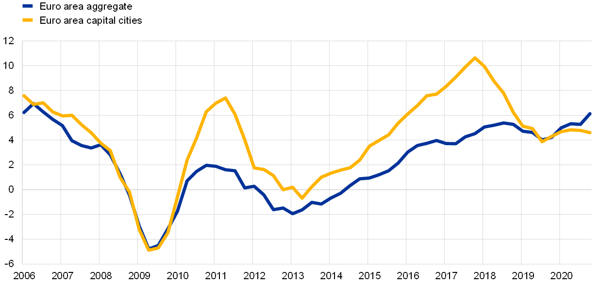 L’ultimo punto osservato dagli economisti della banca riguarda il confronto dei prezzi fra le capitali e il resto del paese. L’analisi parte dalla premessa che i diversi andamenti dei prezzi potrebbero essere spiegati anche alcuni fattori fondamentali, come le differenze di reddito regionale. Rimane il fatto che “nel corso del 2020 i prezzi delle abitazioni nell’area dell’euro in determinate capitali sono aumentati di 0,7 punti percentuali in meno, anno su anno, rispetto all’aggregato dell’area dell’euro”.