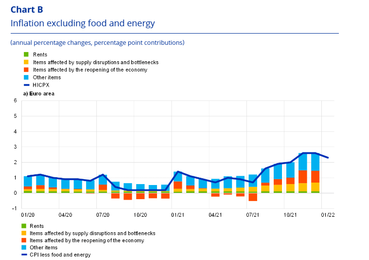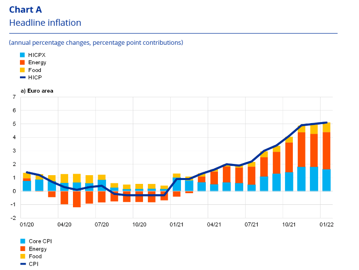 Pure al netto delle componenti energetiche, il dato è superiore ai target. Infatti la componente energetica ha pesato 2,2 punti negli Usa e 2,5 nell’area euro, dove peraltro anche a gennaio l’inflazione compessiva ha proseguito la sua accelerazione (+5,1%). I grafici sotto illustrano gli andamenti inflazionistici al netto di energia e cibo.