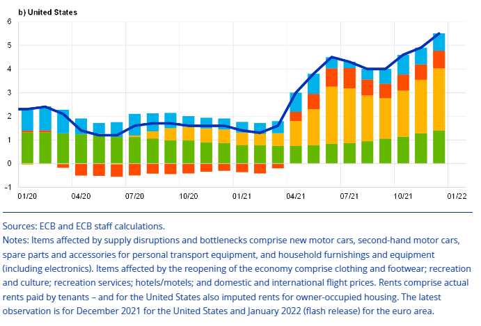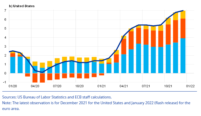 Negli Stati Uniti, inoltre, ha influito molto l‘andamento degli affitti, che hanno una notevole importanza nel paniere inflazionistico americano, mentre le strozzatura sul lato dell’offerta hanno aumentato i prezzi delle auto, nuove e usate, le componenti delle auto, gli arredi e le attrezzature per la casa. Insomma: abitare, mangiare, muoversi (in auto) negli Usa: tutto è diventato più caro, e neanche di poco: “I prezzi di questo gruppo di articoli sono aumentati vertiginosamente durante il secondo trimestre del 2021 e, dopo un breve allentamento, hanno ripreso slancio nell’ultimo trimestre del 2021”, scrive la Bce. Per dare un’idea: solo i prezzi delle auto hanno avuto un peso di 1,6 punti sull’indice.