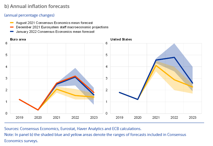 E spiega anche perché si guardi con maggiore preoccupazione agli sviluppi statunitensi. Se c’è un candidato alla spirale salari/prezzi, quello sta oltre Atlantico, non qui da noi. Infatti le previsioni, per quanto siano attendibili – negli ultimi trimestri sono risultate sempre sottostimate – stimano l’inflazione Usa al di sopra del 2% per un tempo assai più lungo di quanto non prevedano in Europa.