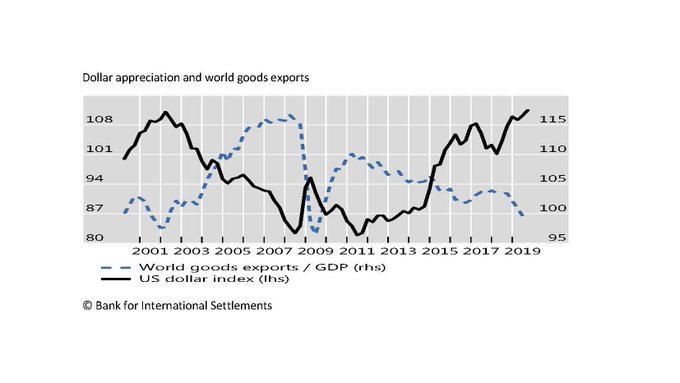 L’origine di questa singolarità è di tipo finanziario. L’apprezzamento del dollaro, che di solito si associa a una restrizione della disponibilità di credito, genera problemi alle imprese che attingono al sistema bancario per finanziare le loro esportazioni. A seguito di un apprezzamento del dollaro, infatti, le banche che si finanziano all’ingrosso acquistando valuta americana riducono l’offerta di credito assai più di quelle che ne fanno meno uso. A loro volta, le imprese che attingono alle banche del primo tipo per le proprie esigenze di finanziamento subiscono una calo delle esportazioni. Vengono inoltre penalizzate le imprese che “hanno esigenze di capitale circolante più elevate e fanno parte di catene produttive più lunghe”.