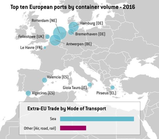 Cominciamo da alcuni numeri. L’economia europea dipende sostanzialmente dalla sua infrastruttura portuale. Il 74% dei beni che circolano sul territorio Ue passano dai porti, secondo quanto riporta Eurostat, che quota in circa 1.700 miliardi (dato anno 2016) il valore delle merci che ricevono ogni anno. Peraltro i porti occupano circa 1,5 milioni di persone. Se osserviamo il dato scorporato per le singole economie abbiamo una visione più chiara dell’importanza strategica dei porti per la nostra economia.