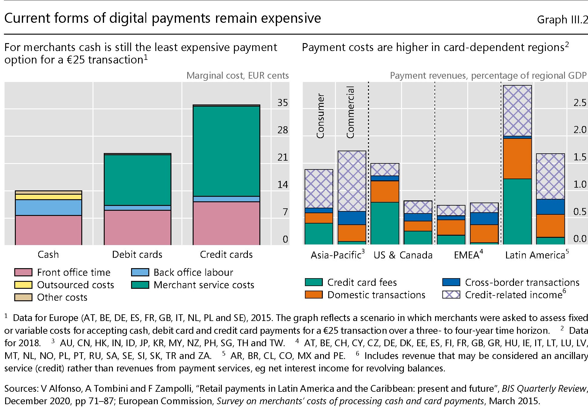Quest’evoluzione è andata di pari passo con quella della diffusione della criptovalute, Bitcoin in testa, e soprattutto delle stablecoin emesse dai grandi giganti di internet. Le due cose insieme lasciano immaginare che il futuro del sistema dei pagamenti sarà sempre più affidato a transazioni smaterializzate, che però non sono ancora efficienti dal punto di vista economico. Infatti, “nonostante decenni di progresso tecnologico che ha drasticamente ridotto il prezzo delle apparecchiature di comunicazione e della larghezza di banda, il costo delle tradizionali opzioni di pagamento digitale come carte di credito e di debito rimane alto e supera ancora quelle dei contanti”. Questi costi non sono visibili dai consumatori, ma vengono caricati sui rivenditori, che perciò hanno pochi incentivi a servirsene o magari possono essere tentati di scaricarli sui consumatori alzando i prezzi di beni e servizi.