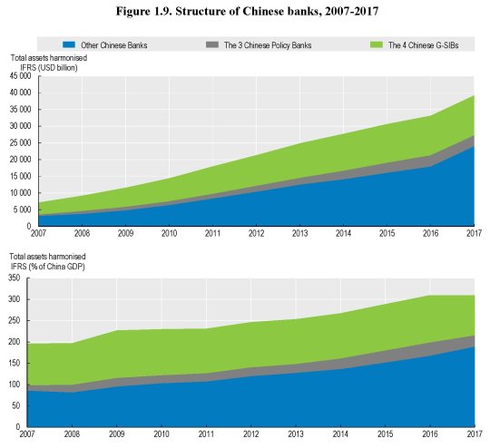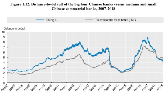 Il grafico mostra che l’indice inizia a declinare da fine 2014, ben prima del picco azionario raggiunto nel maggio 2015, con ciò anticipando i rischi crescenti nel sistema bancario. Il crollo della borsa dopo maggio 2015 e il rallentamento dell’economia ha indotto le autorità ad adottare provvedimenti di contenimento dell’esuberanza azionaria. A metà giugno 2015 per molti titoli di azienda furono sospese le contrattazioni. Quindi furono tagliati i tassi dell’interbancario. A luglio si impedì la vendita di azioni a grandi possessori di azioni, compresi i gestori di WMP. E infine fu svalutato le yuan in agosto. Il risultato, visibile dall’indice sul grafico, fu che i DTD si riportò al livello pre crisi. Superare la crisi potrebbe aver richiesto larghe ricapitalizzazioni dallo stato. E tuttavia dal 2017 il DTD ha ripreso la sua discesa. D’altronde i problemi strutturali della Cina, dall’alto debito delle imprese associata alla crescita del credito tramite l’apertura di pratiche finanziarie innovative, sono tutti lì in attesa di soluzione. Il governo ha detto, con varie voci, di voler provvedere. Ma per adesso ciò che rimane è il rischio. “Ci sono parallelismi fra la Cina e i paesi avanzati, relativamente all’interconnessione delle banche, la gestione della ricchezza, il mercato azionari e il leverage”, scrive Ocse.