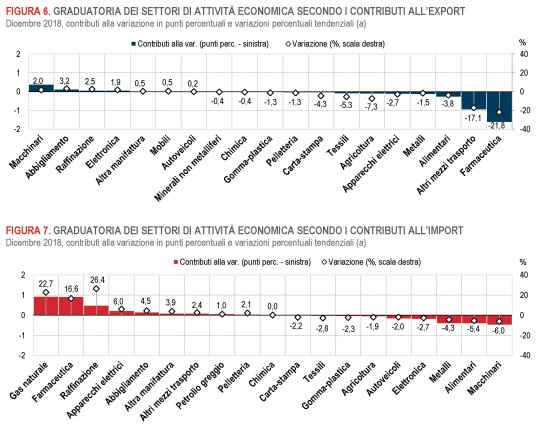 Gli autoveicoli nel 2018 ancora hanno tenuto – nel senso che erano poco più che zero. E il 2019 l’avete visto come è cominciato. Mezzi di trasporto e farmaceutica ci sono costati cari. Quest’ultima, in particolare, sia sul versante dell’import che dell’export.