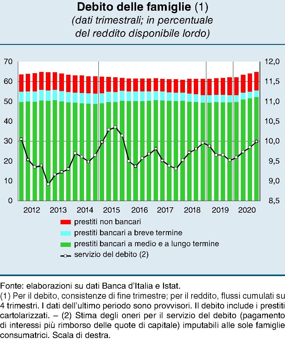 Questa massa di risparmio, in qualche modo “forzato” dall’emergenza sanitaria, vuoi per i lockdown, vuoi per il motivo precauzionale, rimarrà ancora in buona parte immobilizzato. Solo un terzo infatti, secondo la rilevazione della Banca, verrà consumato nel corso dell’anno. La metà rimarrà nella forma di depositi o altre forme di investimento e la quota rimanente servirà a ripagare i debiti, che nel corso della pandemia sono aumentati, arrivando al 64,7% del reddito disponibile.