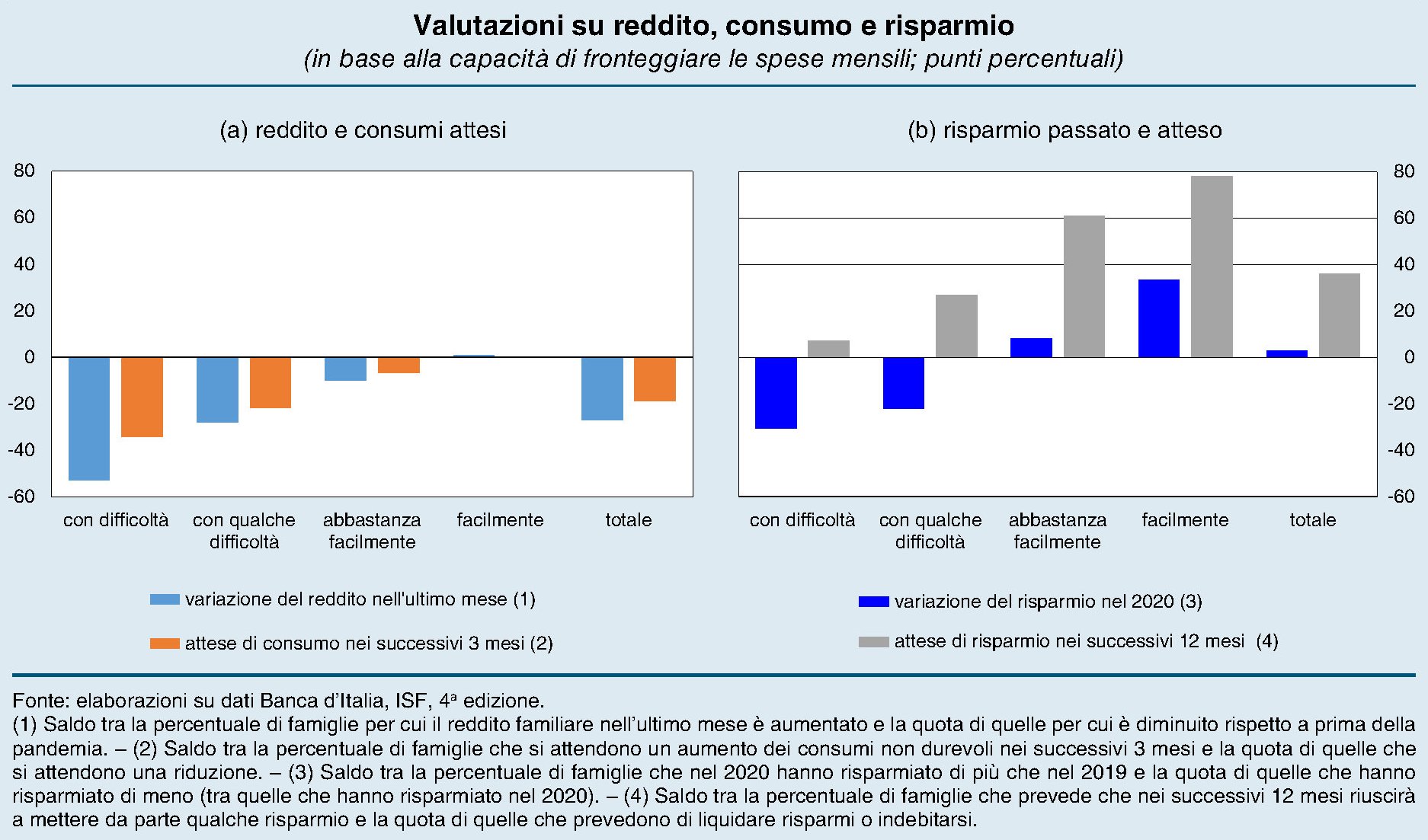 E questo ci conduce alla parte finale dell’analisi: la quota di risparmio. “Una quota significativa di famiglie ha risparmiato nell’ultimo anno”, scrive la Banca. In dettaglio, circa il 40% ha speso meno del reddito 2020, e un terzo di questi ha risparmiato persino di più del 2019. Tale aumento, tuttavia, è concentrato fra le famiglie che arrivano facilmente o molto facilmente a fine mese.