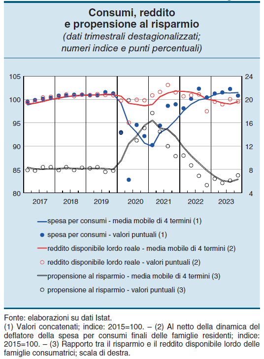 Il grafico che apre questo post ci consente di osservare che l’indice 100, che peraltro fa riferimento al 2015, è quello attorno al quale gravita la linea rossa del reddito reale lordo. Se guardiamo i pallini rossi, che indicano i valori puntuali, ci accorgiamo che in alcuni momenti recenti, ossia quando l’inflazione ha morso più selvaggiamente, siamo scesi ben sotto 100, quindi sotto il livello del 2015. E l’inflazione non è certo diminuita da allora. I prezzi acquisiti non scenderanno. Il meglio che possa capitare è che crescano meno di prima. E infatti la propensione al risparmio è letteralmente crollata arrivando sotto il valore del 2017.