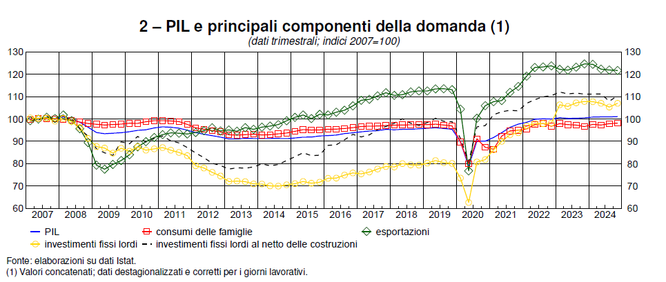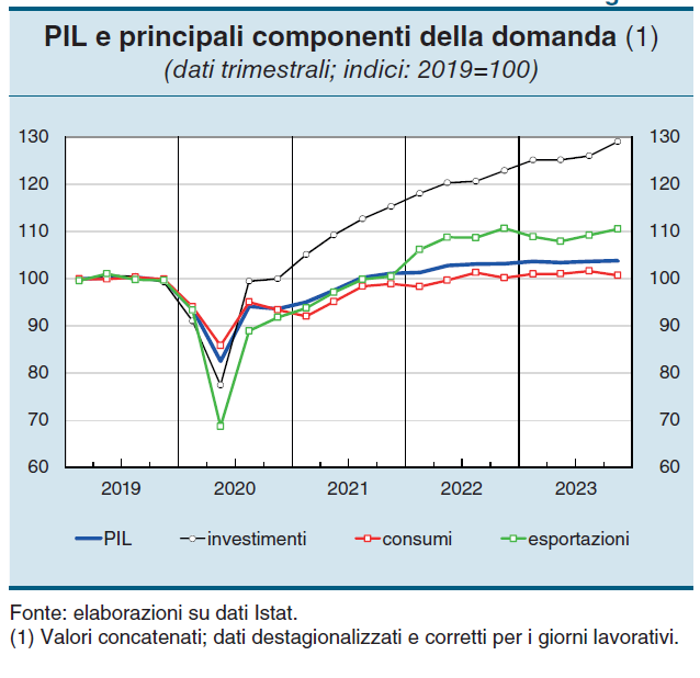 Notate che la linea rossa dei consumi è praticamente ferma, e non da oggi. In pratica sono inchiodati ai livelli del 2019. La nostra crescita è dipesa in larga parte dagli investimenti, cresciuti del 30 per cento dal 2019, e dall’export.