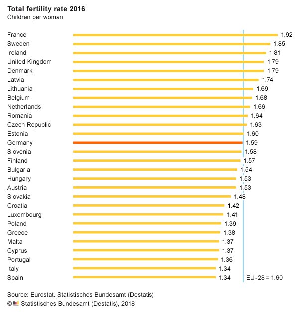 Si vedrà. Intanto contentiamoci di osservare il miracolo tedesco e capire perché ha gambe robuste ma caviglie fragili, a causa della sua terribile situazione demografica che dovrebbe suscitare in noi molte domande, se non fossimo così abituati a preferire le risposte. Il fallimento demografico della Germania è la cartina tornasole della fragilità economica tedesca così ben dissimulata dai suoi numeri rutilanti: dal Pil, agli attivi di conto corrente, alla disoccupazione risibile. Ma anche sulla demografia le scelte contano. Nel gran dibattere, spesso ideologico e poco informato, che si fa sulla questione dell’immigrazione dovremmo osservare con interesse il dato più recente dell’indice di natalità tedesco (riferito al 2016), che adesso supera 1,5 – che è sempre poco – ma veniva da poco più di 1,3 nel primo decennio del XXI secolo prima che la Germania, sfidando ogni buon senso popolare, decise di farsi carico di un milione di profughi.