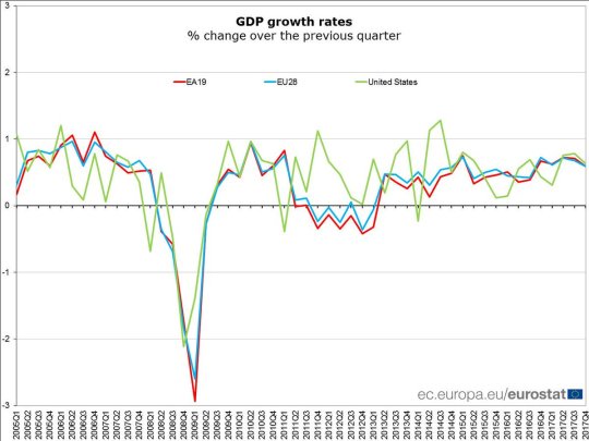 Notate come la curva della crescita dell’Eurozona incroci quella Usa, e poi aprite le orecchie perché anche oggi risuona il frastuono allarmato dei gufi di mestiere, che si sono accorti che l’inflazione Usa è cresciuta più del previsto, arrivando al 2,1% su base annua. Basta questo a far ripartire la tiritera che le borse calano perché hanno paura che la Fed alzi i tassi prima e più del previsto. Roba talmente stucchevole, specie in un giorno di festa, che preferisco cedere al sadomasochismo e osservare la Germania che ha fatto lo 0,6 di Pil in più sul trimestre precedente e il 2,9 su base annua stracciando tutti.