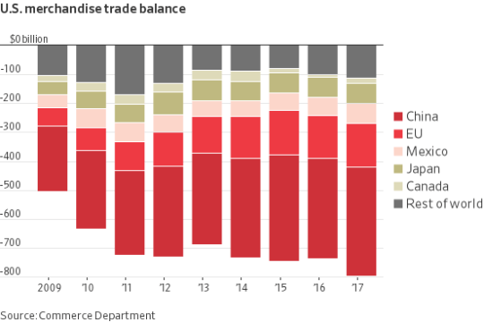 E così via. Pensate che ne usciremo indenni? Macché. Ai più curiosi farà piacere sapere che il deficit commerciale degli Usa con la Cina è iniziato nel 1985 e non si è mai ridotto, anzi è aumentato. Ma mica solo nei confronti della Cina. Guardate questo riepilogo proposto oggi sul WSJ.