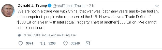 Quelli che temono una guerra commerciale fra Usa e CIna stiano sicuri: c’è già. Trump, non contento d’aver daziato i cinesi e il resto del mondo, pure se con ampie esenzioni, su acciaio e alluminio, e poi aver proseguito coni dazi ad personam contro i cinesi – che hanno amorevolmente ricambiato – ha fatto sapere oggi di aver messo all’indice un’altra vagonata di prodotti cinesi per una cinquantina di miliardi di valore. Questi ultimi, i cinesi non i prodotti, stavolta hanno reagito più rapidamente del solito e hanno daziato per uguale importo un migliaio di prodotti Usa, fra i quali la soia e gli aeroplani, due delle grandi gioie esportatrici dell’Impero d’Occidente. Dopodiché i diplomatici cinesi hanno aggiunto che la Cina è aperta a un dialogo sulla base di “basi paritarie e mutuo rispetto”.