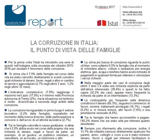 Come ha fatto l’Istat a elaborare questo piccolo capolavoro? Ha intervistato 43 mila persone fra i 18 e gli 80 anni, un gruppetto di cittadini , molti dei quali han dovuto cedere alle prepotenze dei cattivoni che affollano il nostro paese. Mica pochi, peraltro. L’Istat stima che i fenomeni corruttivi abbiamo coinvolto il 7.9% delle famiglie italiane, col picco del 17,9% nel Lazio e il minimo in Trentino (2%).
