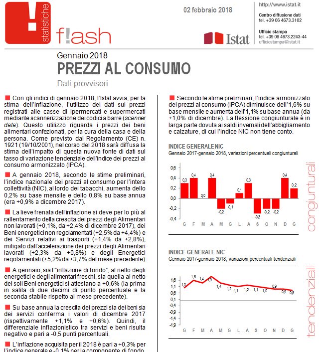 Numero del giorno: 0,8 Crescita inflazione su base annua in Italia a gennaio 2018