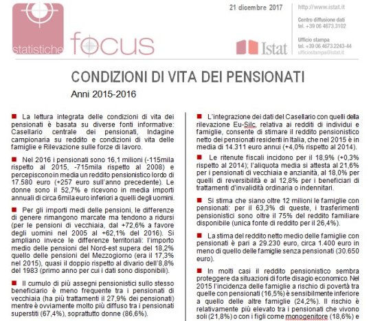 Di fronte a questo teatrino vagamente scoraggiante capite bene perché risulti così seducente l’isola felice della pensione pure a vent’anni. Per farvi un’idea di come vadano le cose laggù, leggetevi l’ultima release di Istat dedicata proprio ai nostri cari, nel senso di amati e dispendiosi, pensionati.