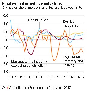 L’altra arriva dalla Germania, di recente nelle grazie del Fmi per le sue performance. Oggi l’istituto di statistica ha diffuso i dati sull’occupazione, sottolineando che rispetto a un anno fa gli occupati sono aumentati di 638 mila unità nel primo quarto del 2017 rispetto al primo 2016. Il grosso della crescita è tirato dai servizi.