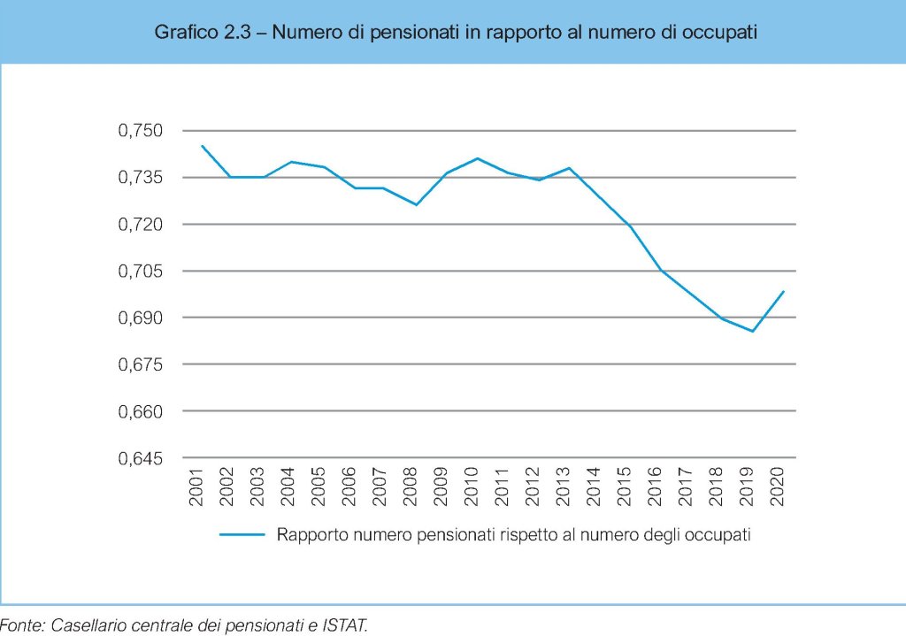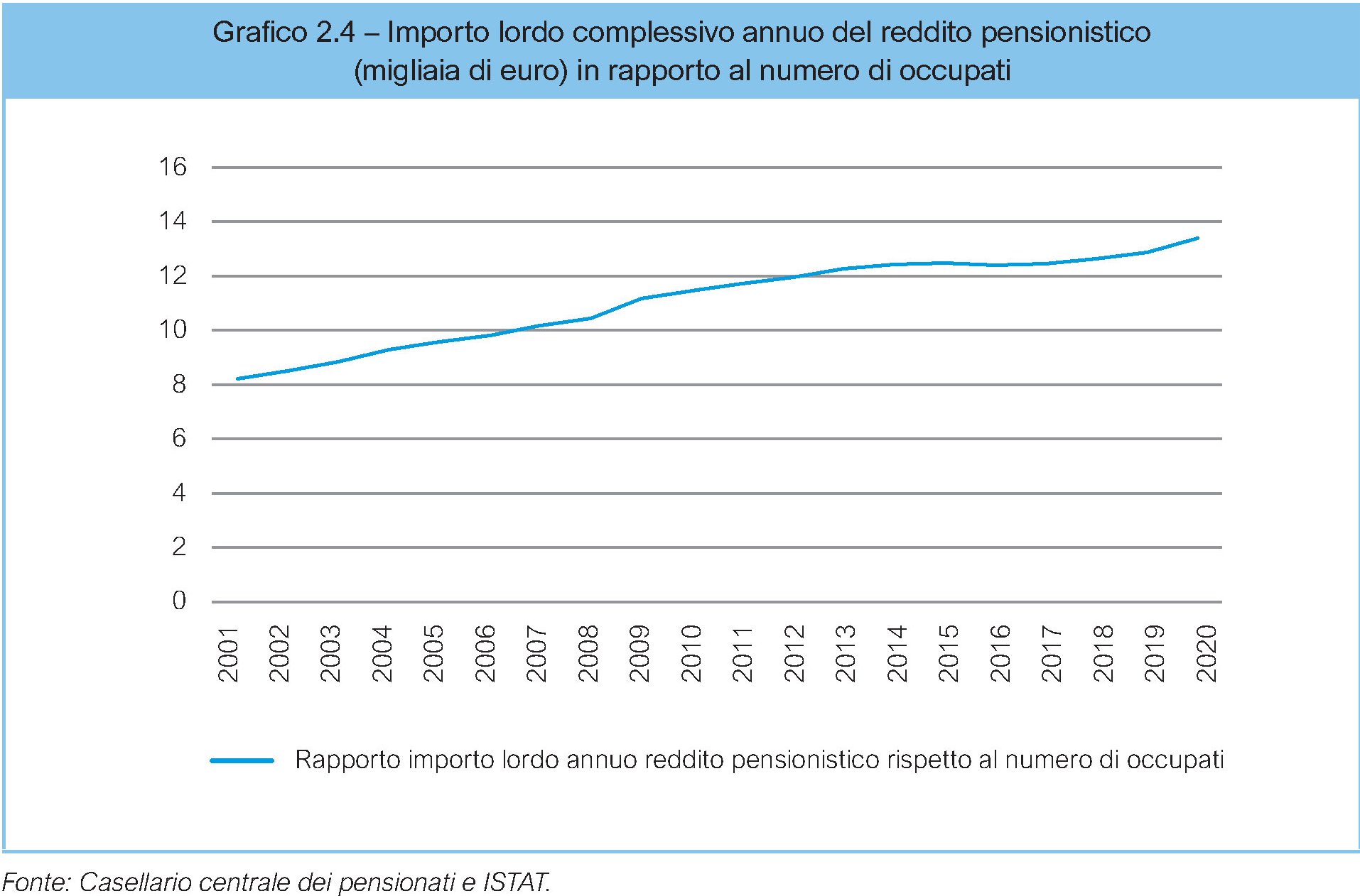 Anche l’aumento del rapporto, che si vede a partire dal 2020, è una conseguenza della pandemia, che ha provocato un brusco calo dell’occupazione. Ma in ogni caso rimane la tendenza di fondo, che è collegata a un’altra altrettanto rilevante: quella fra l’importo delle pensioni e il numero degli occupati.