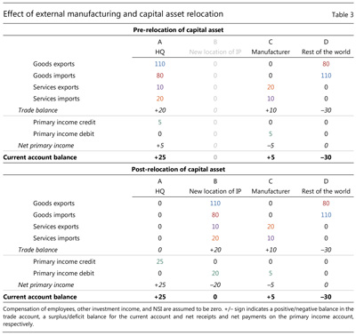 Come si vede, il paese A, che ha trasferito al paese B non solo il domicilio ma anche i diritti di proprietà intellettuale, incassa sempre 25 ma tutto sulla voce dei redditi, quindi senza alcun effetto sulla bilancia commerciale, quattro quinti dei quali derivanti da proprietà intellettuale e un quinto in qualità di profitto estratto dal paese produttore C. Ciò significa che il paese B accumula debiti verso il paese A che corrispondono a un aggiustamento di valutazione (SFA) per il paese che lo decide. Ciò in quanto il diritto trasferito viene trascritto come attivo nella contabilità dell’azienda estera domiciliata in B e come debito per la sussidiaria che risiede nel paese A, che corrisponde a sua volta a un aumento degli investimenti diretti del paese A tramite la componente SFA.