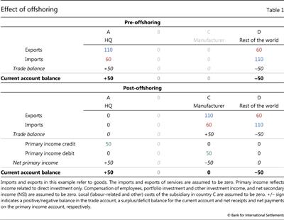 Prima dell’offshoring il paese che produceva ed esportava in eccedenza otteneva un attivo di conto corrente che derivava dal conto merci. Nel secondo caso il pese dove si svolge la produzione registra un’eccedenza sul conto merci e un debito sul conto dei redditi primari, che corrisponde all’attivo sullo stesso conto del paese che ha esternalizzato la produzione. Rimane l’attivo di conto corrente per il paese A, ma muta la natura: dalle merci ai redditi.