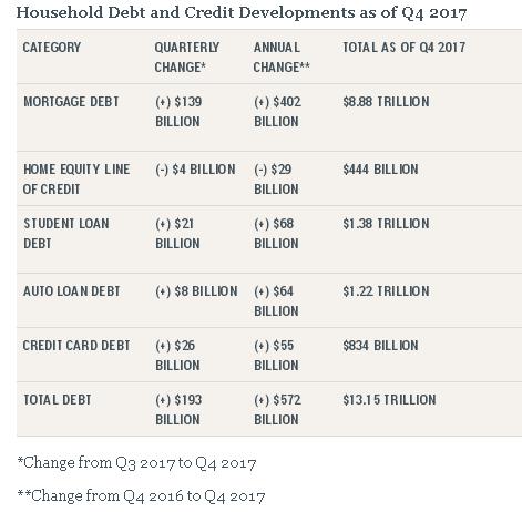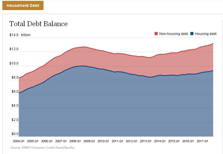 Gli appassionati delle ricorrenze osserveranno con un certo sconcerto la curva dei debiti delle famiglie Usa superare ampiamente il picco del terzo trimestre 2008, all’esplodere della crisi, quando avevano raggiunto i 12,68 trilioni di dollari, 2,69 dei quali erano debiti non collegati alle abitazioni a differenza del resto (9,99 trilioni). Crisi che ormai è stata dimenticata, a quanto pare, visto che al quarto trimestre 2017 il debito totale si collocava 13,15 trilioni di dollari, dopo un anno di crescita straordinaria.