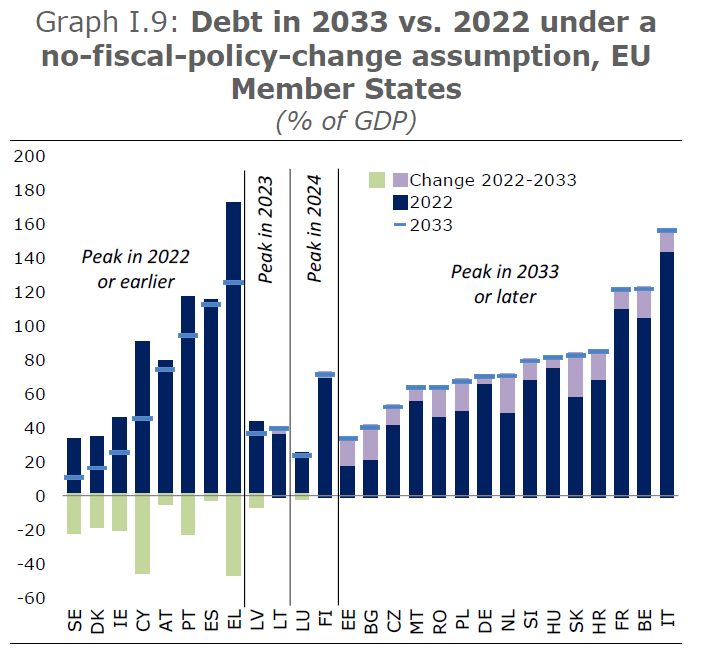 Ma quando leggo di quanto sia rilevante la domanda interna italiana per l’eurozona, mi torna in mente tutta la lamentazione europea di venti o trenta pagine prima sulla politica fiscale, secondo la quale dovremmo avere un’avanzo primario di almeno il 5% del Pil per iniziare una traiettoria davvero declinante del debito. E per riuscirci possiamo solo continuare il consolidamento fiscale, che ovviamente ha un effetto assai drastico proprio sulla domanda domestica.