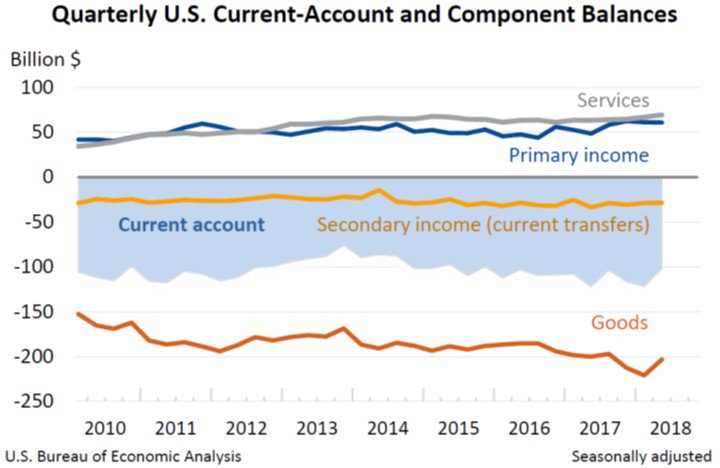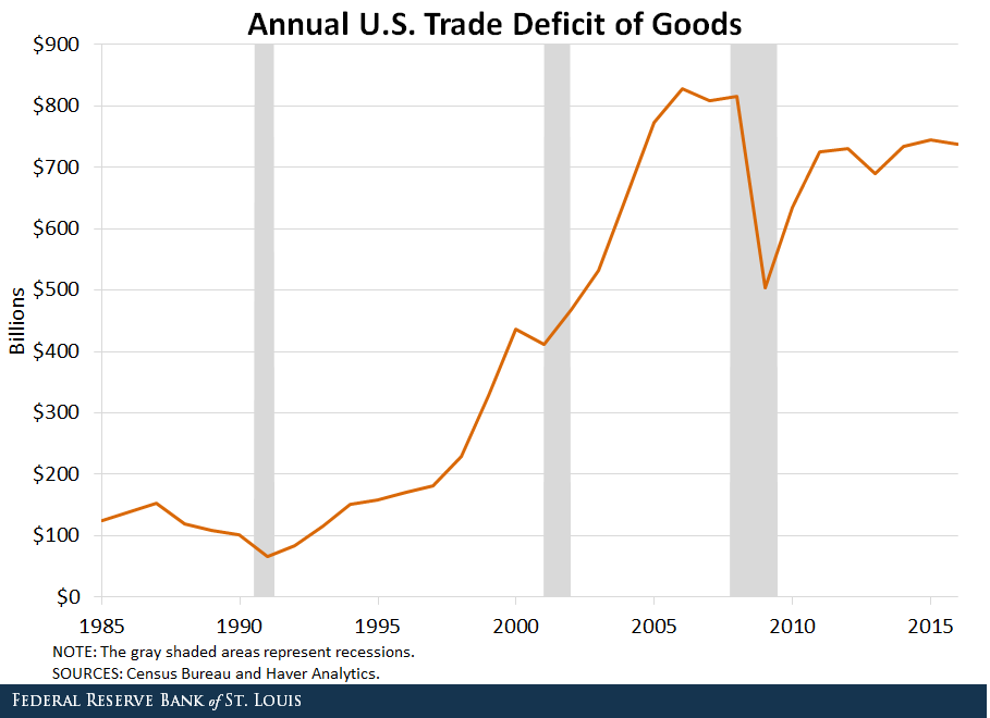 Tale pensiero è diventato quasi un’ossessione negli ultimi anni. Alcuni ipotizzano che a scatenare certe nostalgie sia stata la crescente diseguaglianza che per una serie di ragioni viene associata alla globalizzazione, e quindi alla aumentata mobilità di cose e persone. Questa almeno è la tesi di un ricercatore della Fed di S. Louis che ha pubblicato un post che contiene una domanda molto interessante: “Il nazionalismo economico beneficerebbe gli Usa?”. Domanda attuale, peraltro, visto che il presidente statunitense non perde occasione per lamentare la situazione commerciale Usa, pesantemente deficitaria, e accusare i partner eccedentari di scarso fairplay. Questo grafico ci ricorda quale sia la situazione commerciale statunitense.