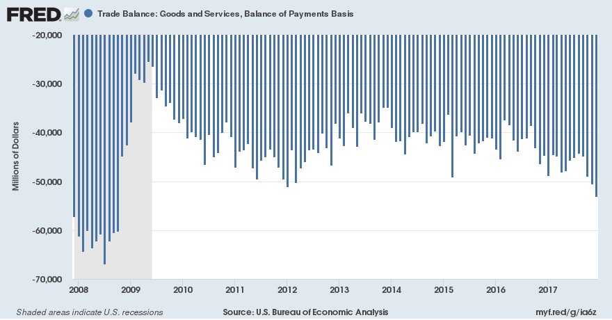 Il profondo rosso del deficit commerciale americano. A dicembre il deficit commerciale Usa ha raggiunto un altro picco, superando i 53 miliardi di dollari, il più ampio dall’ottobre 2008 che tutti ricordano come il mese nero dell’economia Usa e poco dopo internazionale. Il deficit è cresciuto verso i principali partner, a cominciare dalla Cina ed è un segnale che le politiche intraprese dall’amministrazione Trump non sembra stiano raggiungendo l’obiettivo prefissato, ossia recuperare l’ampio deficit nei commerci dal parte del gigante americano.