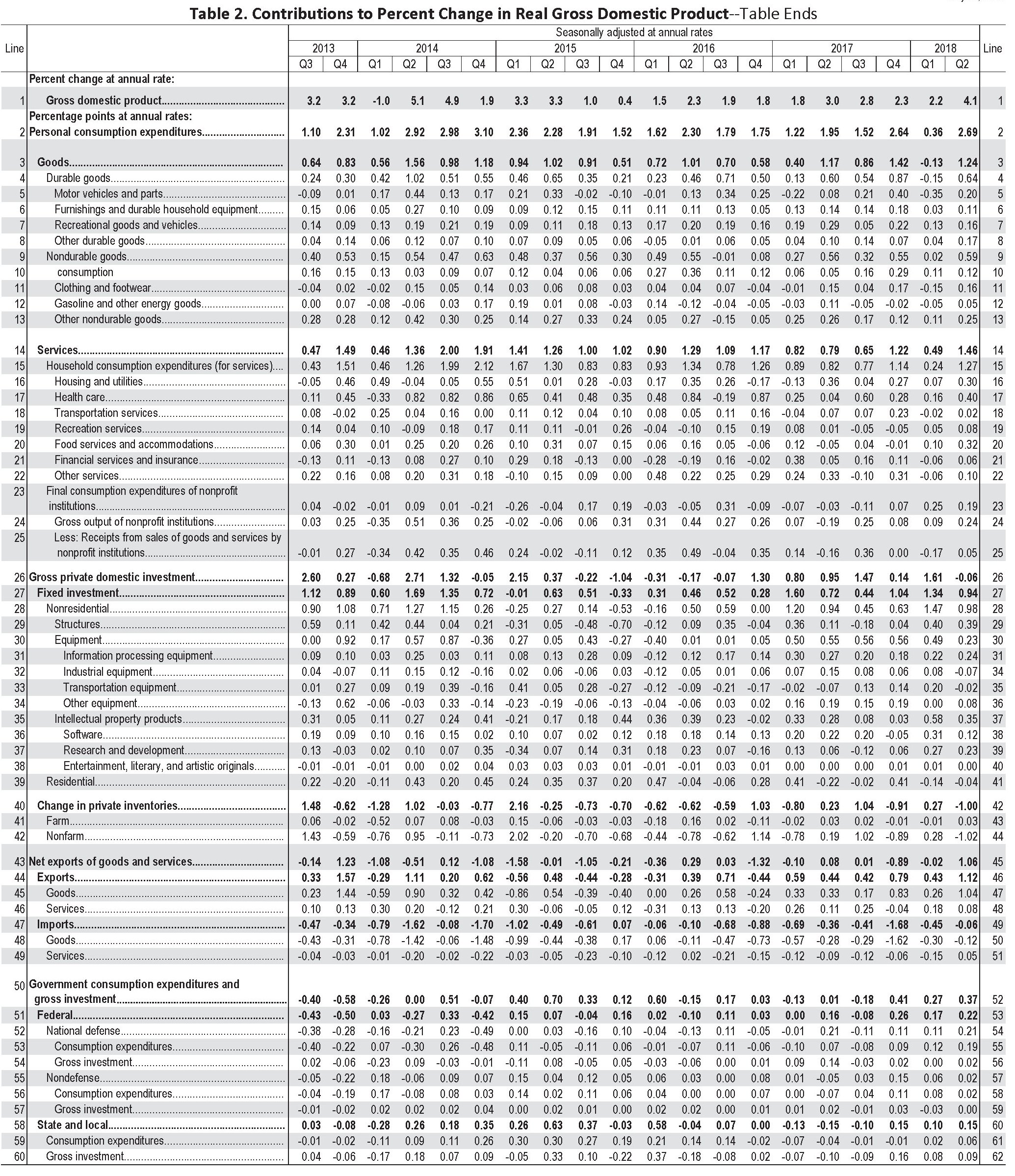 Come si può osservare il risultato del primo trimestre replica al ribasso quello del terzo trimestre 2014. Quindi non è di per sé eccezionale, ma sicuramente rilevante. Se leggiamo il commento degli analisti statunitensi scopriamo che “l’aumento del Pil reale nel secondo trimestre (2018, ndr) riflette i contributi positivi della spesa personale per consumi (PCE), delle esportazioni, degli investimenti fissi non residenziali, della spesa del governo federale e spesa pubblica statale e locale, parzialmente compensati dai contributi negativi delle scorte e degli investimenti fissi residenziali”. Quindi la crescita è stata dovuta all’aumento della spesa per consumi privati e al buon andamento dell’export, e in particolare dell’export netto. Ma prima di approfondire vediamo i dati disaggregati e su un orizzonte di tempo lungo.