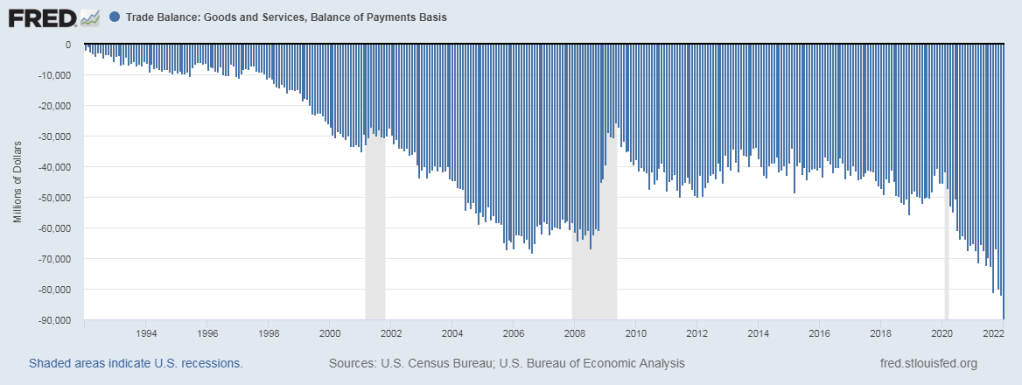 Ora che ha toccato i 90 miliardi di dollari, nove volte tanto quello degli anni ’90 del XX secolo, la storia del deficit commerciale americano s’iscrive d’ufficio fra quelle che vale la pena raccontare. Seppur breve – un trentennio più o meno – promette di durare a lungo, e chissà quali sorprese ci riserverà adesso, con un mondo squassato da guerre ed epidemie. Il peggio, infatti, si è osservato negli ultimi mesi. Aspettiamo speranzosi che qualcuno si cimenti, perciò. Noi cominciamo dal titolo: Supermarket Usa.