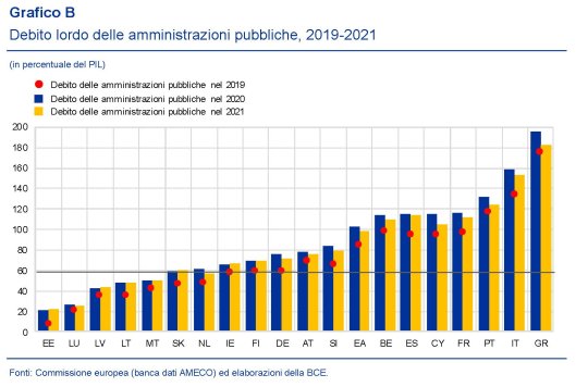 Questi andamenti ovviamente hanno un effetto diretto sui livelli di debito pubblico, riepilogati nel grafico sotto.