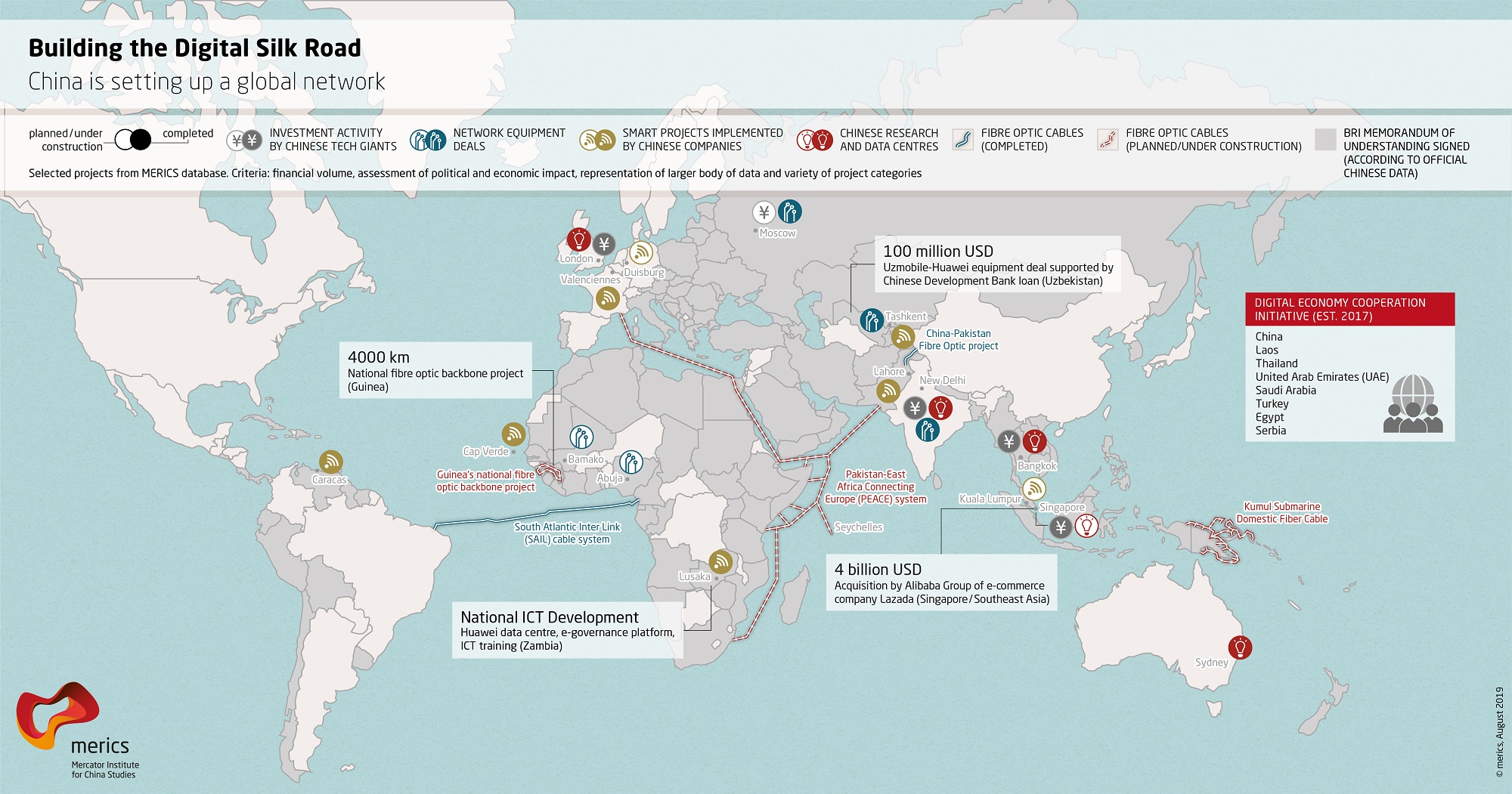 La guerra commerciale, infatti, è solo la linea di faglia di un confronto assai più ampio diffuso su vari fronti uno dei quali, quello per la tecnologia, primeggia per importanza strategica. Abbiamo più volte analizzato questa prospettiva, ma uno studio recente del Mercator Institute for China, pensatoio europeo di cose cinesi, ci consente di avere una ricognizione aggiornata su uno dei progetti cinesi più importanti sul tappeto e che, non a caso, ha alimentato molte cronache del confronto sino-americano (si pensi al caso Huawei): la digital silk road di Pechino.