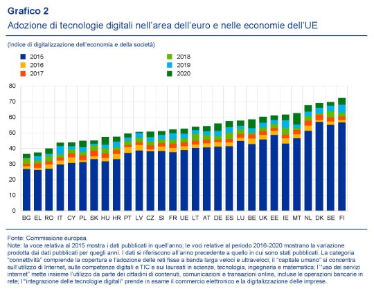 E anche le ricognizioni sul contributo dell’economia digitale alla crescita dell’occupazione lo confermano: “Le economie con un’incidenza più elevata di economia digitale sul valore aggiunto totale tendono a essere quelle con tassi di disoccupazione più bassi”, scrive la Bce.