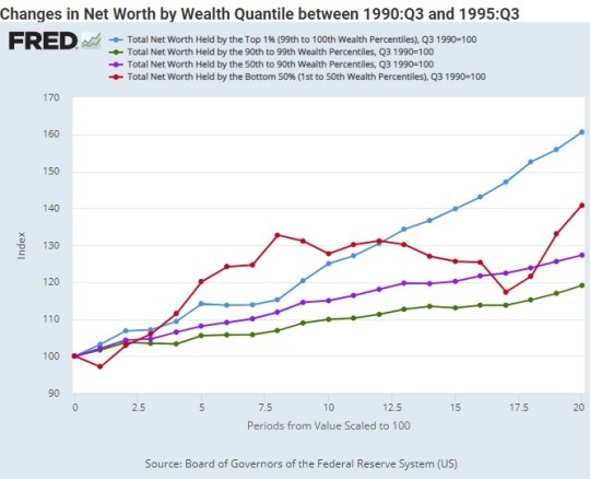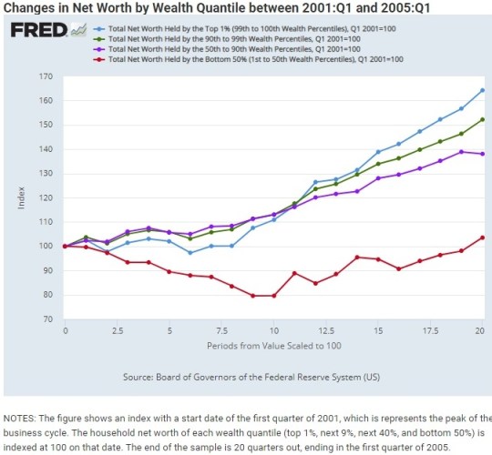 La prima cose che si nota è che al termine della recessione, durata circa tre trimestri, sia l’1% al top che il 50% al bottom avevano incrementato di circa il 10% il loro livello di ricchezza. Le classi centrali stanno leggermente sotto, e questa tendenza rimane anche alla fine dei venti trimestri, che vedono la ricchezza netta per l’1% aumentata di circa il 60% e del bottom del 40%. Le classi centrali stanno ampiamente al di sotto. Interessante notare come a un certo momento e per circa sei trimestri, l’incremento della ricchezza dei bottom sia stato superiore a quello dei top.