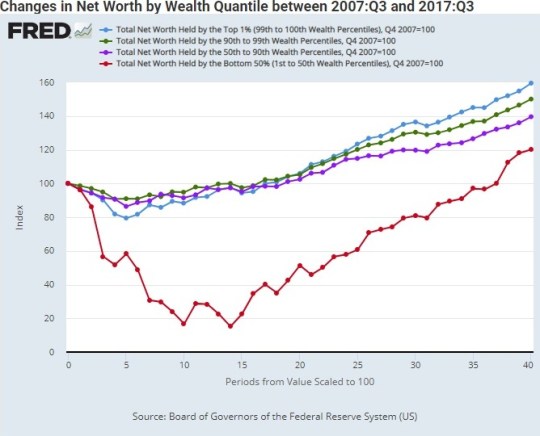 La circostanza invece che i più ricchi siamo maggiormente dotati di asset finanziari spiega bene perché il recupero dei più ricchi sia stato più veloce. Le politiche monetarie della Fed, con il QE e i tassi a zero, hanno avuto fra le altre cose l’effetto di stimolare i mercati finanziari e quindi di recuperare facilmente le perdite del periodo di recessione, concludendo il ciclo con una maggiore ricchezza.
