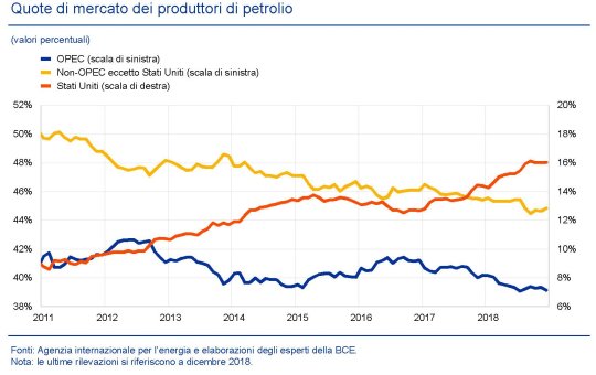 Tutto ciò conduce a una conclusione che, pur avendo cause economiche ha profonde ripercussioni politiche. In sostanza, come ha notato la Bce nel suo ultimo bollettino, il ruolo dell’Opec nella determinazione dei prezzi si è ridimensionato, pure se rimane un “fattore importante nella dinamica dei corsi petroliferi”. I produttori tradizionali hanno provato a mettere fuori gioco i produttori shale Usa provocando un aumento di offerta per far scendere i prezzi. Ma alla fine il gioco si è ritorto contro di loro. “Tali azioni – sottolinea la Bce – hanno portato soltanto a una riduzione di breve durata della produzione di petrolio da scisti. Alla fine del 2016 l’Opec è stato costretto a riesaminare il proprio approccio, poiché le preoccupazioni relative al livello della domanda globale hanno portato a ulteriori ribassi dei corsi petroliferi. Inoltre, la strategia dell’Opec ha gravato sulle finanze pubbliche dei suoi membri e gli indicatori sulla loro sostenibilità sono peggiorati bruscamente fra il 2014 e il 2016 per la maggior